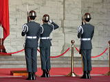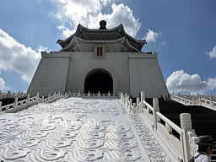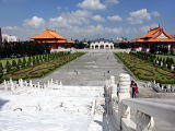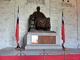 | 中華民国の元総統:蒋介石を忍んで建てられた記念堂です。台北市の中心部にあり、杭州南路から西、中山南路から東、愛国東路から北、信義路から南に囲まれた区域で、敷地は25万平方メートルにも達する広大な場所(中正公園)です。ここは外国人観光客がよく訪れる台北の観光スポットの一つであり、正門の大中至正門には「大中至正」の四文字が刻まれています。中正紀念堂の屋根には北京の天壇様式が採用され、建物は四方から眺めるとエジプトのピラミッドのように見えるなど、独特な設計法が用いられています。清廉かつ広大さを象徴する白い大理石と青い瑠璃瓦を主体にした建物の周りにはベニ花が植えられており、中華民国の国旗の配色をイメージしています。これは自由、平等、博愛のシンボルで、非凡な風格で台北のランドマークの一つとなっています。中正紀念堂には、大きな蒋介石の銅像が置かれ、毎正時には衛兵交代式が行われています。陳列室には蒋介石氏の過去の功績に関する展示物が並べられています。執務室を再現した展示もあり蒋介石の蝋人形は本物そっくりです。 | |||