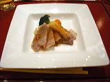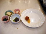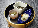 | 前菜 秋田の味盛り合わせ 山本産ジュン菜酢、ギバサの割醤油掛け 秋鮭のしょっつる焼き、カスベの唐場げ オードブル スモークサーモンのカルパッチョ仕立て 十文字産菊の花ドレッシング |